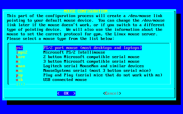 This subsection simply asks what kind of mouse you have, and whether you want gpm(8) console mouse support enabled on bootup.